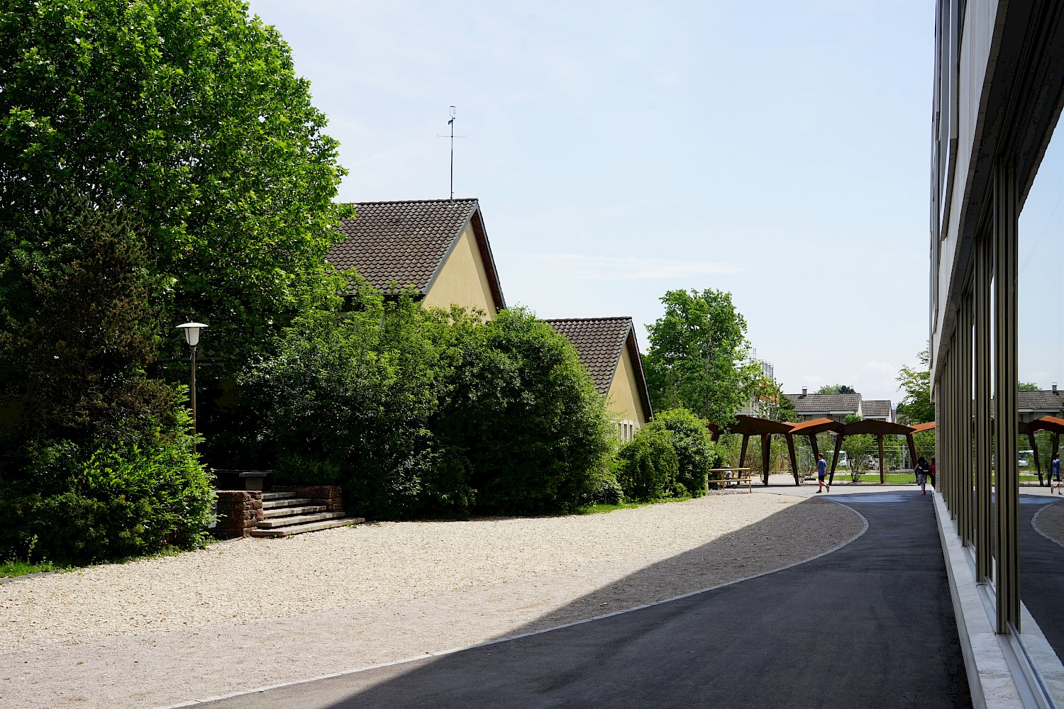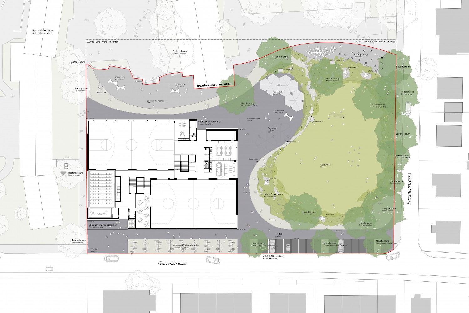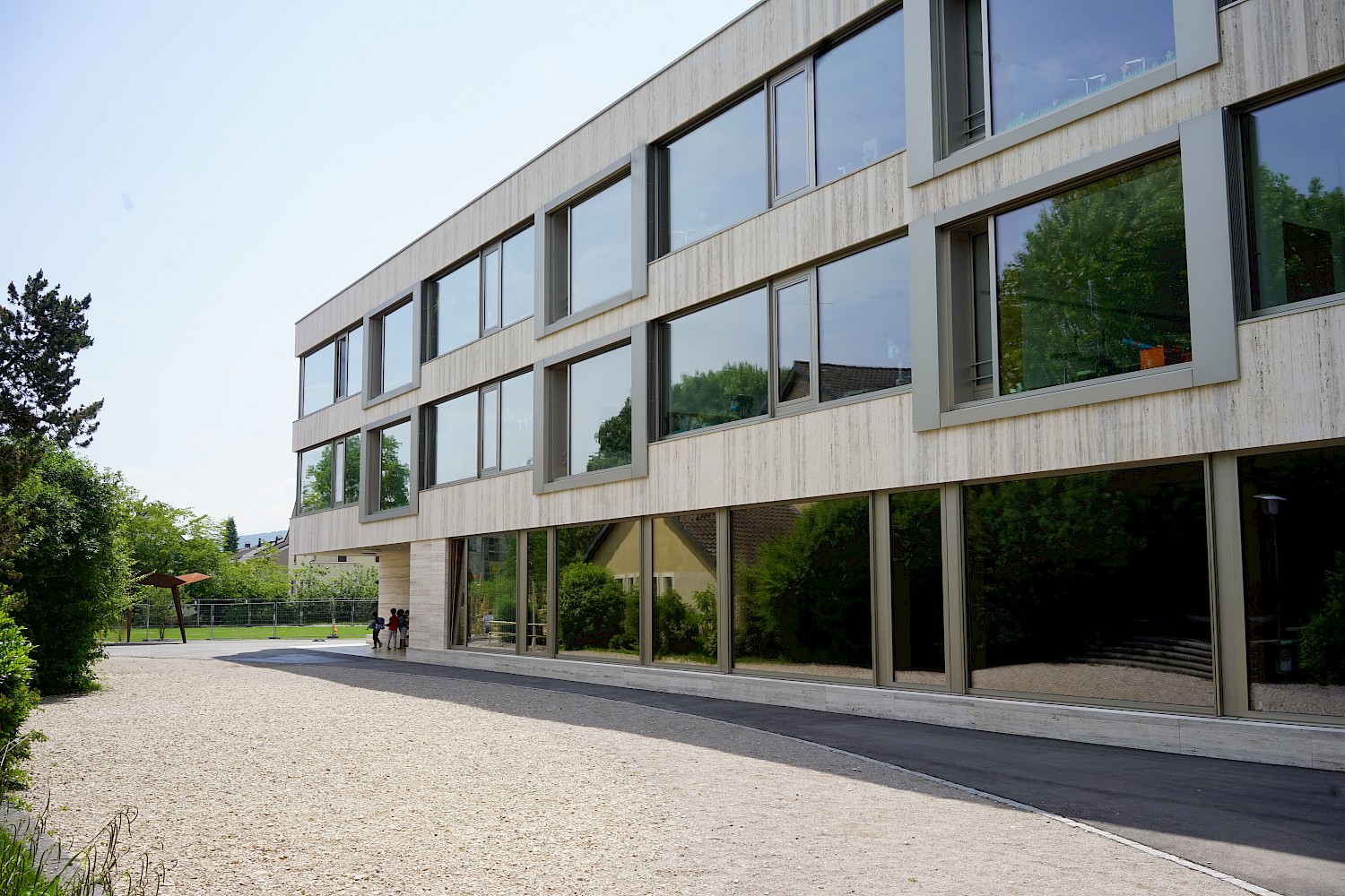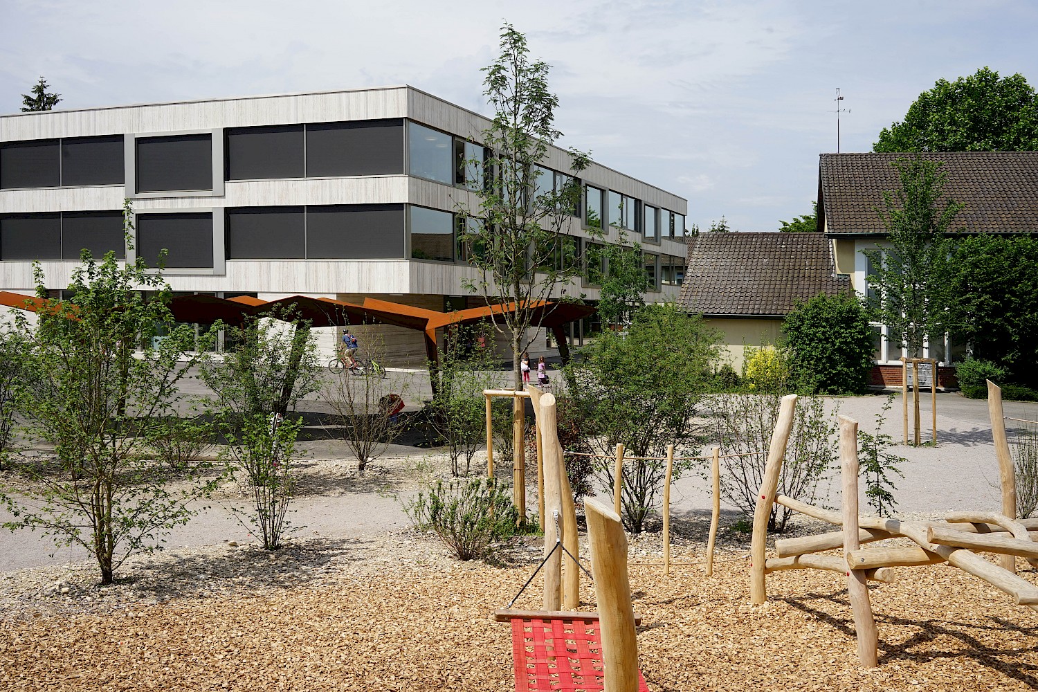 Mit der neuen Primarschule entsteht eine Schnittstelle zwischen alt und neu, wo die Landschaft an den einstigen Bestand, dessen organischen Formensprache und dem ausgewogenen Verhältnis von Hart- und Grünflächen reagiert. Bestehende Bäume übernehmen dabei vom ersten Tag an eine Raumbildung rund um den Schulhof. Sowohl im schulischen als auch im sozialen Sinne wird der Aussenraum als Lernwelt verstanden. Er bietet den Kindern unterschiedlich dichte Bereiche, die verschiedenste Raumdimensionen für Bewegung, Rückzug und Beobachtung ermöglichen. Das eigens entwickelte Pausendach schafft die Brücke zwischen Architektur und Aussenraum und kann auf Grund seiner modulhaften Ausgestaltung beliebig erweitert und ergänzt werden.