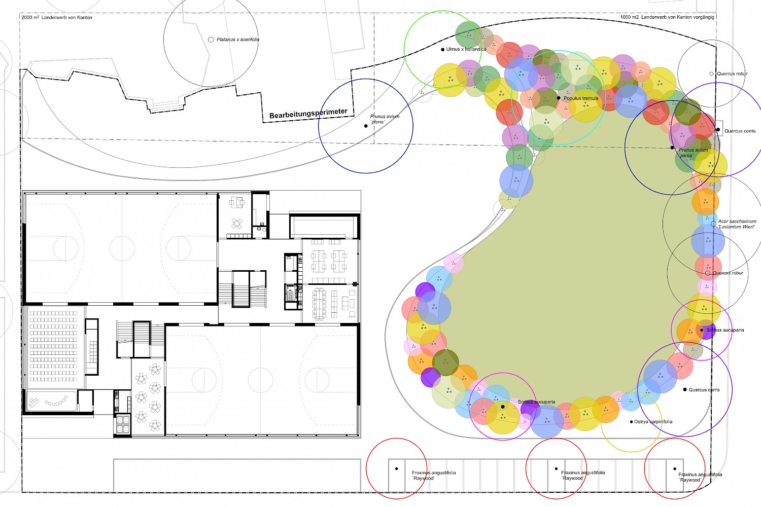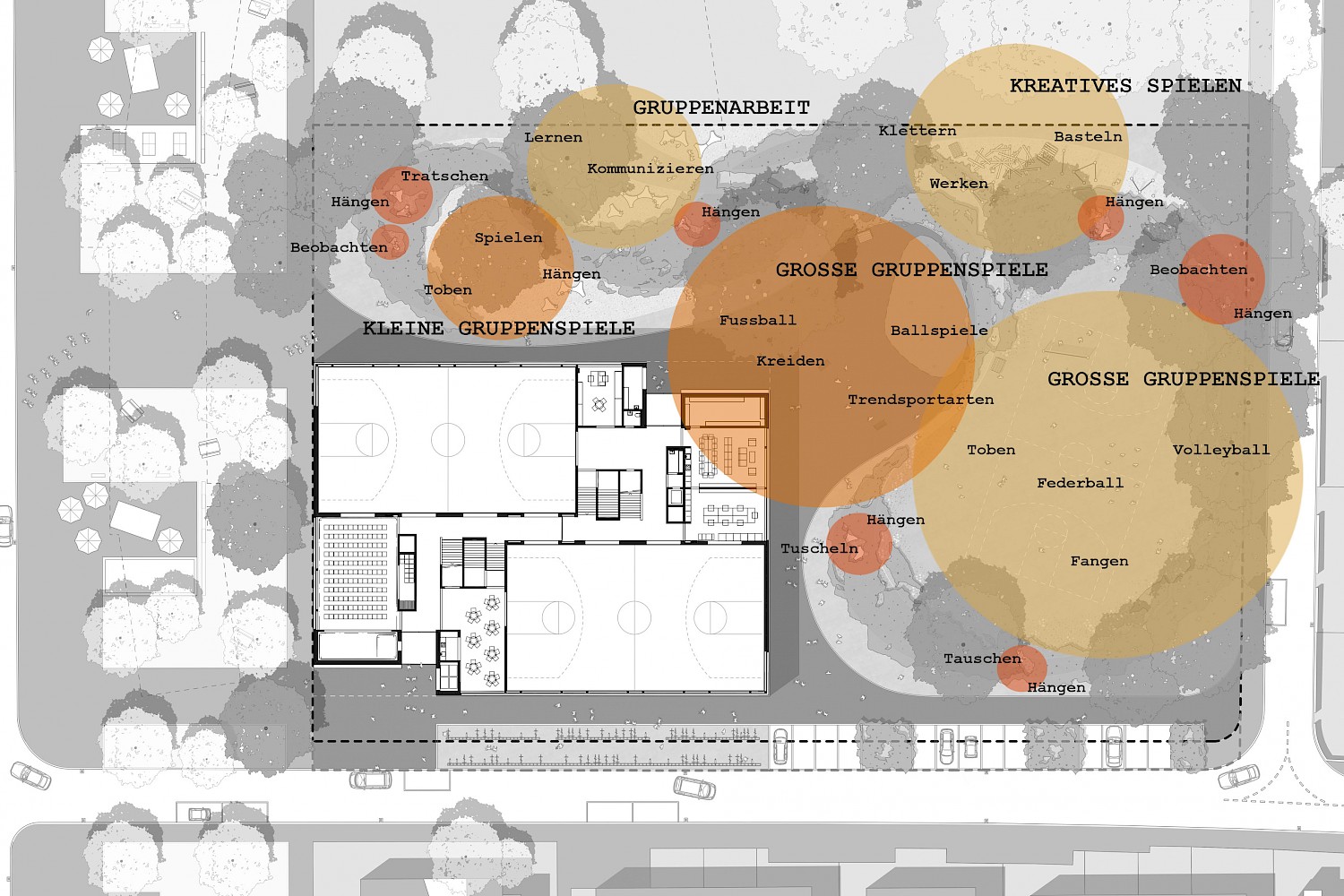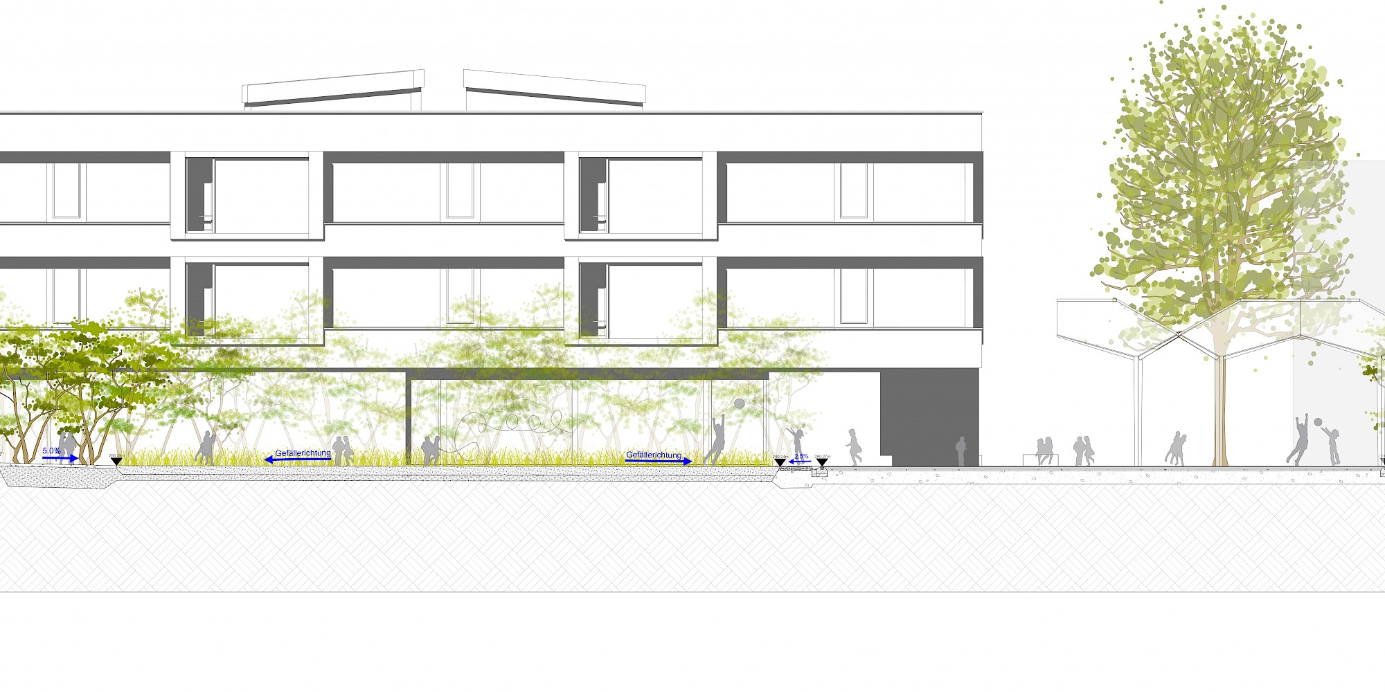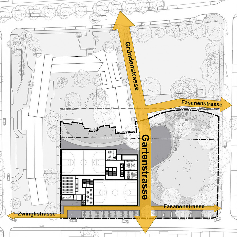 Mit der neuen Primarschule entsteht eine Schnittstelle zwischen alt und neu, wo die Landschaft an den einstigen Bestand, dessen organischen Formensprache und dem ausgewogenen Verhältnis von Hart- und Grünflächen reagiert. Bestehende Bäume übernehmen dabei vom ersten Tag an eine Raumbildung rund um den Schulhof. Sowohl im schulischen als auch im sozialen Sinne wird der Aussenraum als Lernwelt verstanden. Er bietet den Kindern unterschiedlich dichte Bereiche, die verschiedenste Raumdimensionen für Bewegung, Rückzug und Beobachtung ermöglichen. Das eigens entwickelte Pausendach schafft die Brücke zwischen Architektur und Aussenraum und kann auf Grund seiner modulhaften Ausgestaltung beliebig erweitert und ergänzt werden.