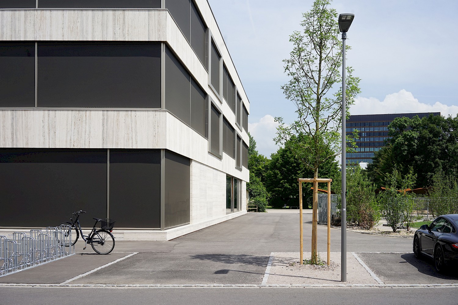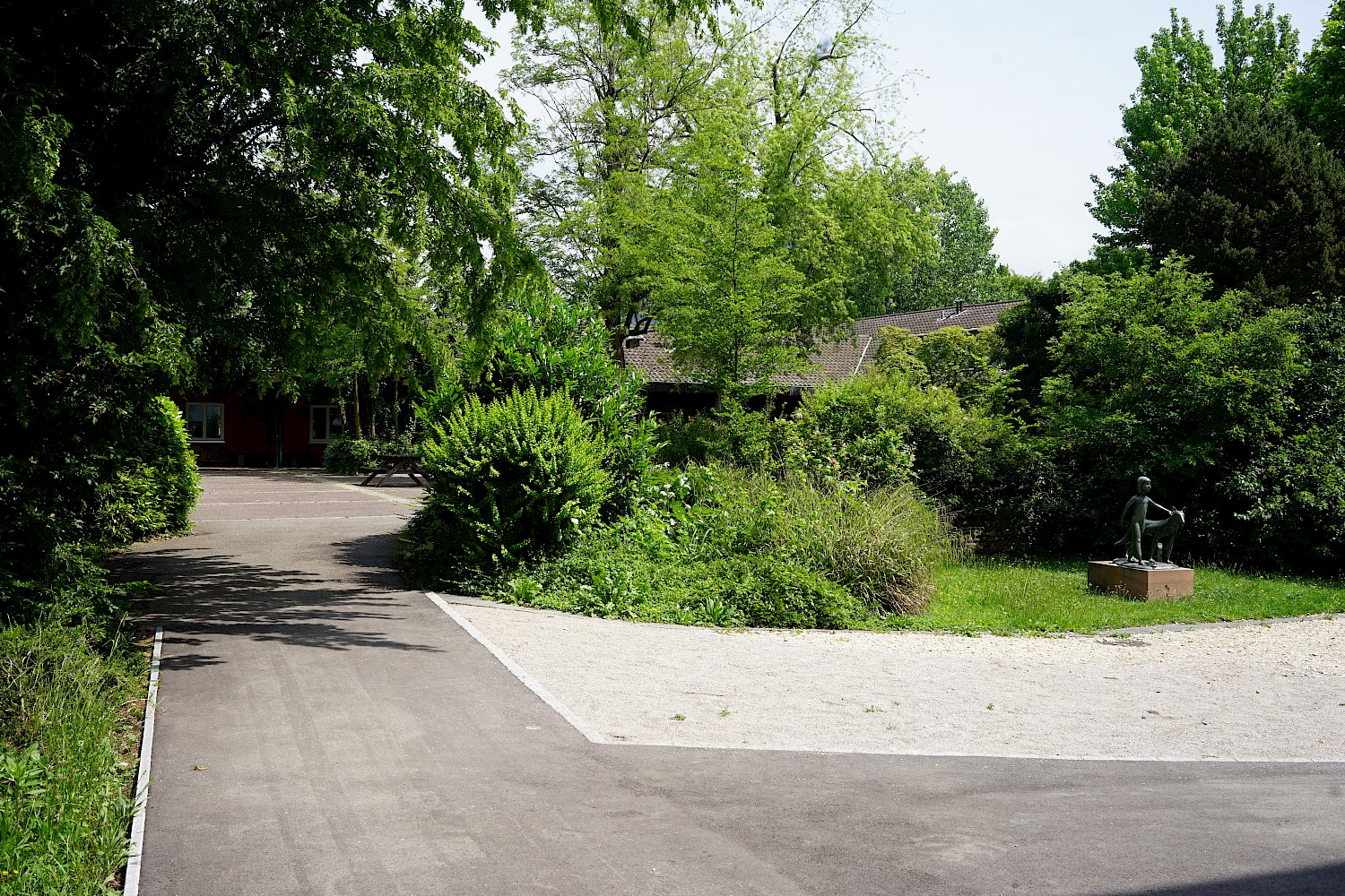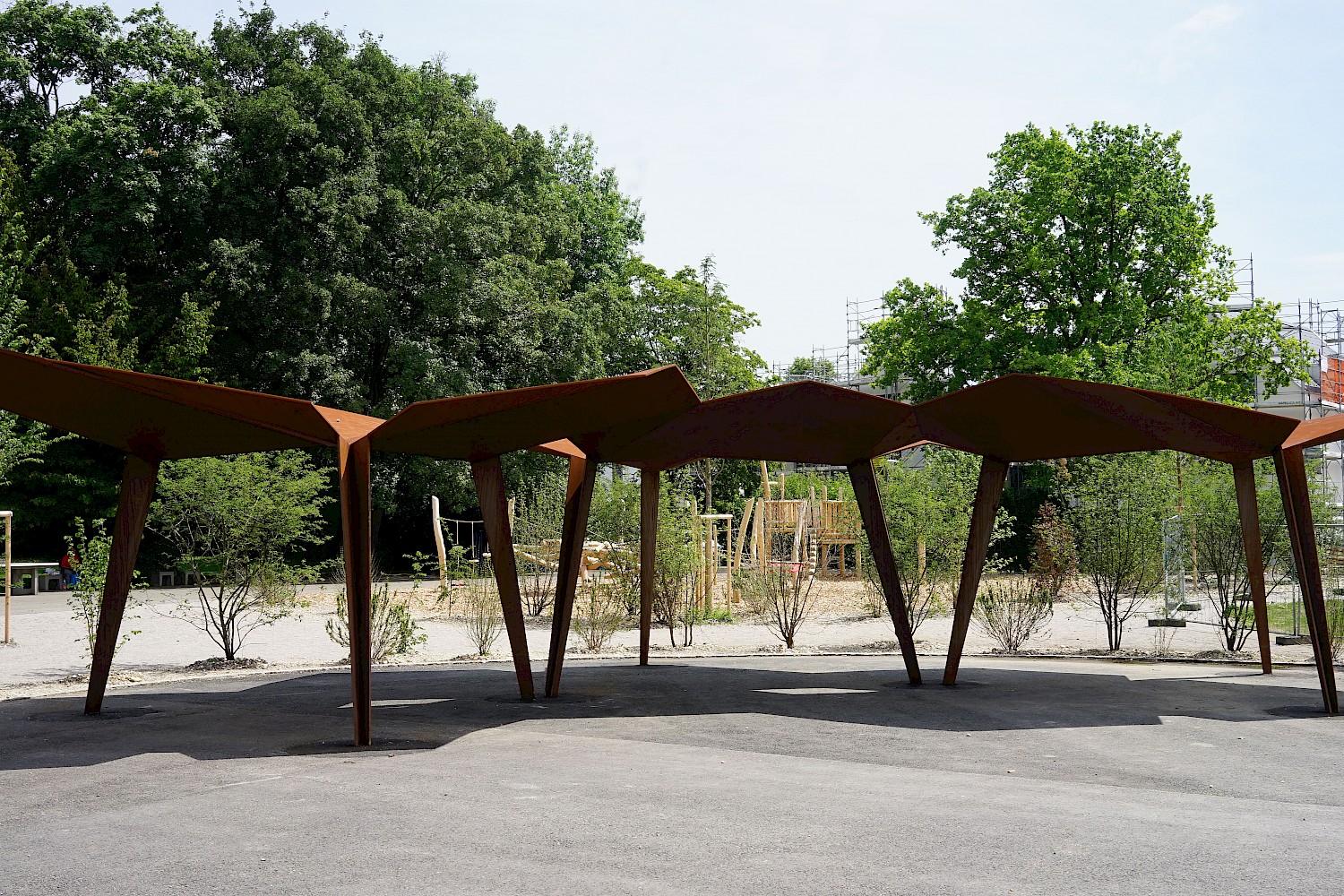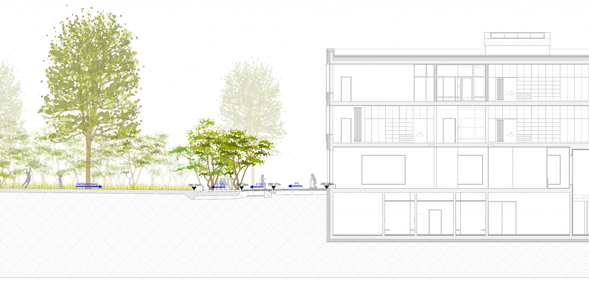 Mit der neuen Primarschule entsteht eine Schnittstelle zwischen alt und neu, wo die Landschaft an den einstigen Bestand, dessen organischen Formensprache und dem ausgewogenen Verhältnis von Hart- und Grünflächen reagiert. Bestehende Bäume übernehmen dabei vom ersten Tag an eine Raumbildung rund um den Schulhof. Sowohl im schulischen als auch im sozialen Sinne wird der Aussenraum als Lernwelt verstanden. Er bietet den Kindern unterschiedlich dichte Bereiche, die verschiedenste Raumdimensionen für Bewegung, Rückzug und Beobachtung ermöglichen. Das eigens entwickelte Pausendach schafft die Brücke zwischen Architektur und Aussenraum und kann auf Grund seiner modulhaften Ausgestaltung beliebig erweitert und ergänzt werden.