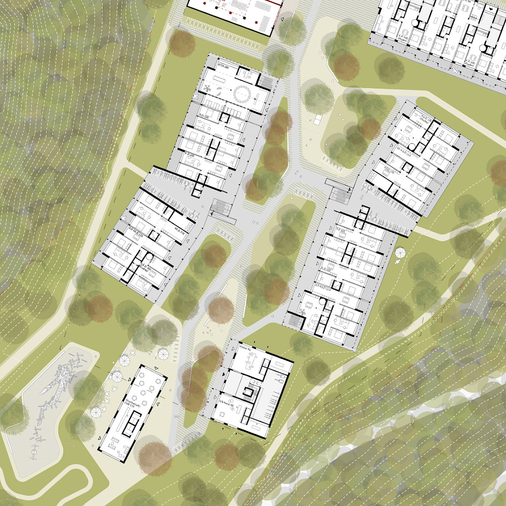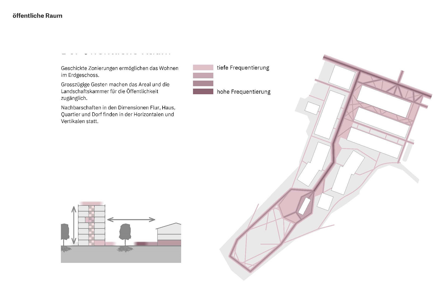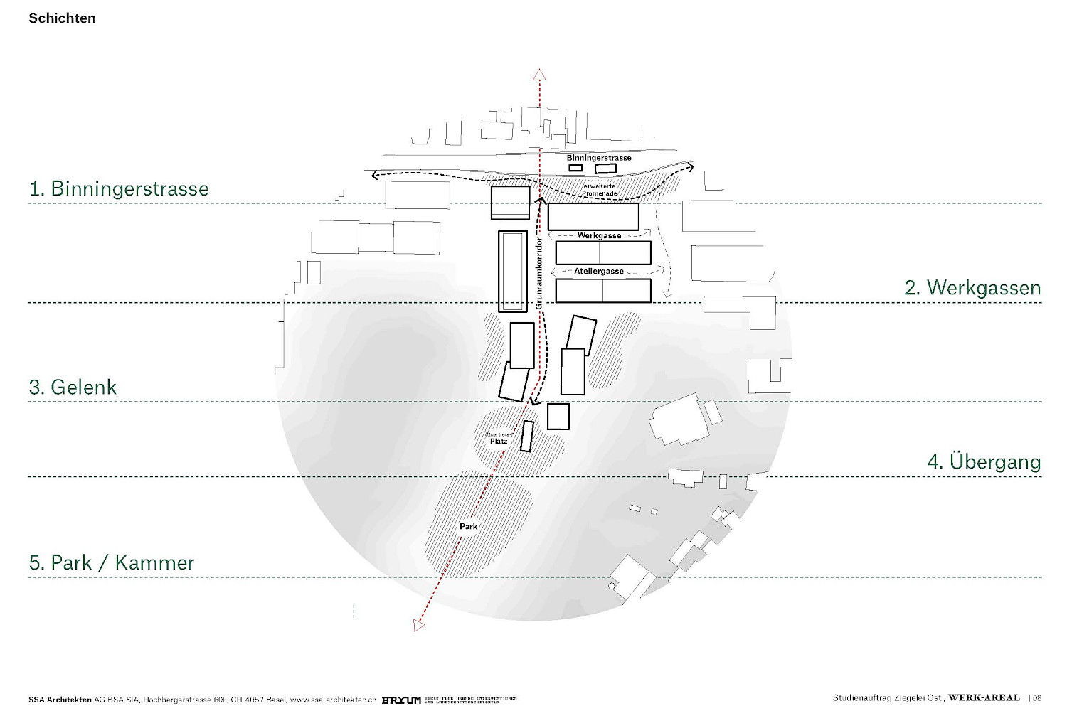 Die Gemeinde sowie die Eigentümerin beabsichtigen auf dem ehem. Ziegeleiareal zusätzlich auch Wohnnutzungen zuzulassen und somit ein urbanes Wohn- und Gewerbequartier zu realisieren. Die Anforderungen an die neue Überbauung sind vielfältig. Das neue Areal soll neben seiner öffentlichen Ausstrahlung, der Koexistenz zwischen Öffentlichkeit, Urbanität und den Bedürfnissen nach Privatheit im Quartier gerecht werden. Eine entscheidende Rolle spielt dabei die Ausformulierung glaubwürdiger Aussenräume, die eine Wohnnutzung im EG ermöglichen. Die Vernetzung von Innen- und Aussenraum und der Zugang zu gemeinschaftlichen Sozialräumen unter Einhaltung der Privatheit, sind ein zentrales Thema für die Ausbildung eines zukunftsfähigen Raumgefüges