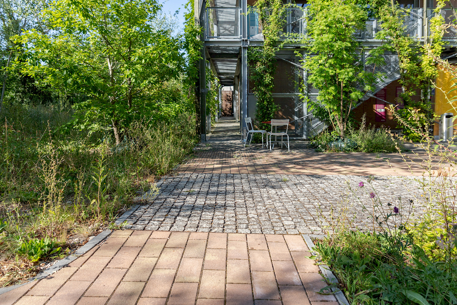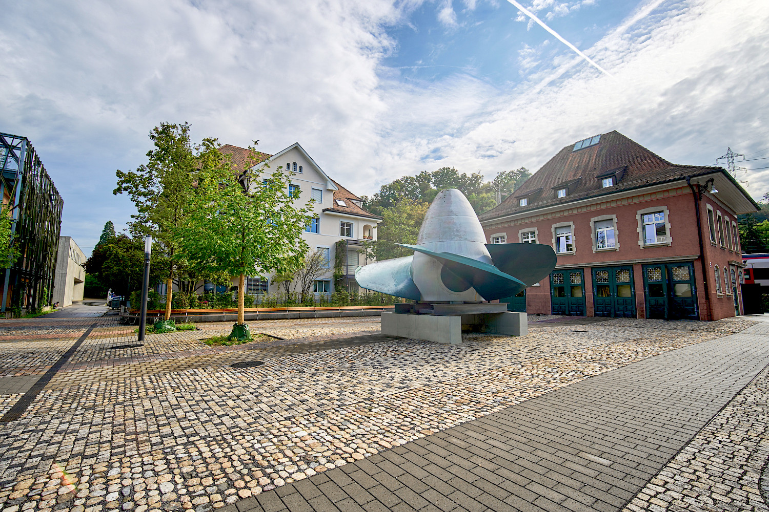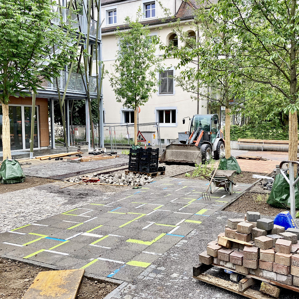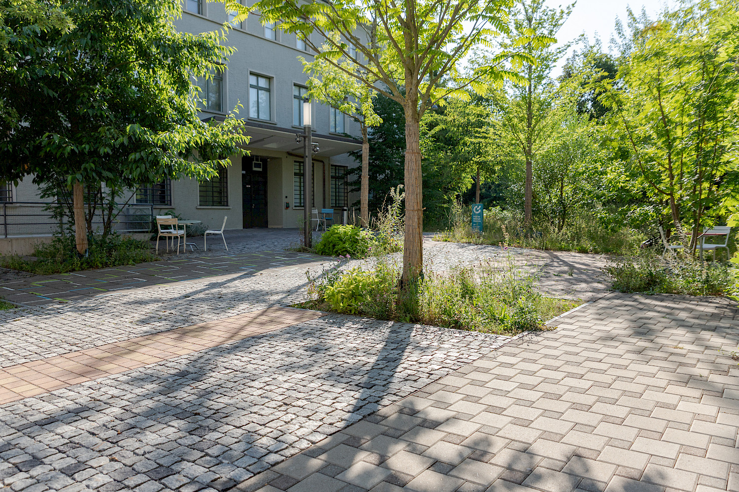 Das neue Besucherangebot «Primeo Energie Kosmos» beschäftigt sich mit den wichtigen Fragestellungen zu Energie und Klima. Als Ort der Wissensvermittlung war im Aussenraum vor allem die Sichtbarmachung einer nachhaltigen Kreislaufwirtschaft von Bedeutung. Aus wiederverwendeten und geretteten Pflastersteinen wurde ein kompletter Platz im Sinne des ReUse-Gedankens geschaffen. Das flexible Konzept der «Streifen» ermöglichte Änderungen im Materialbezug und Bauprozess. Neben seiner Funktion als Empfangs- und Ausstellungsfläche wird der Platz somit selbst zum Ausstellungsobjekt. Die darauf gepflanzten Klimabäume greifen zusätzlich die Thematik des Klimawandels auf. Der Übergang zum angrenzenden Birsraum wird mit ortstypischer Vegetation gestärkt.