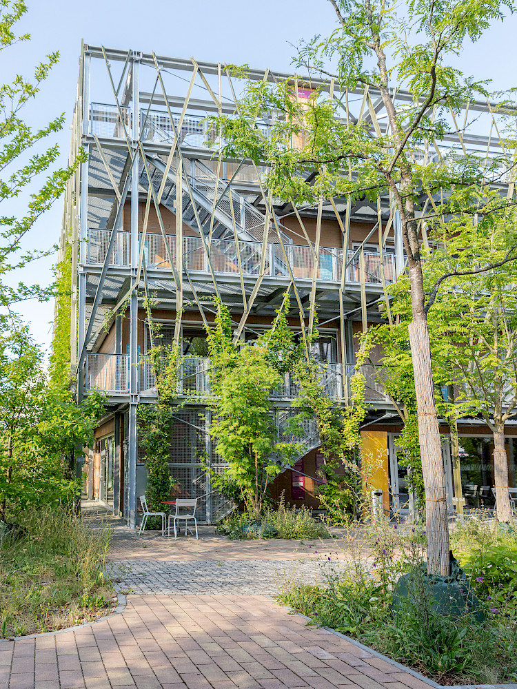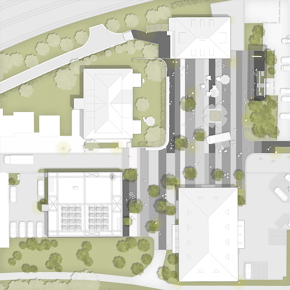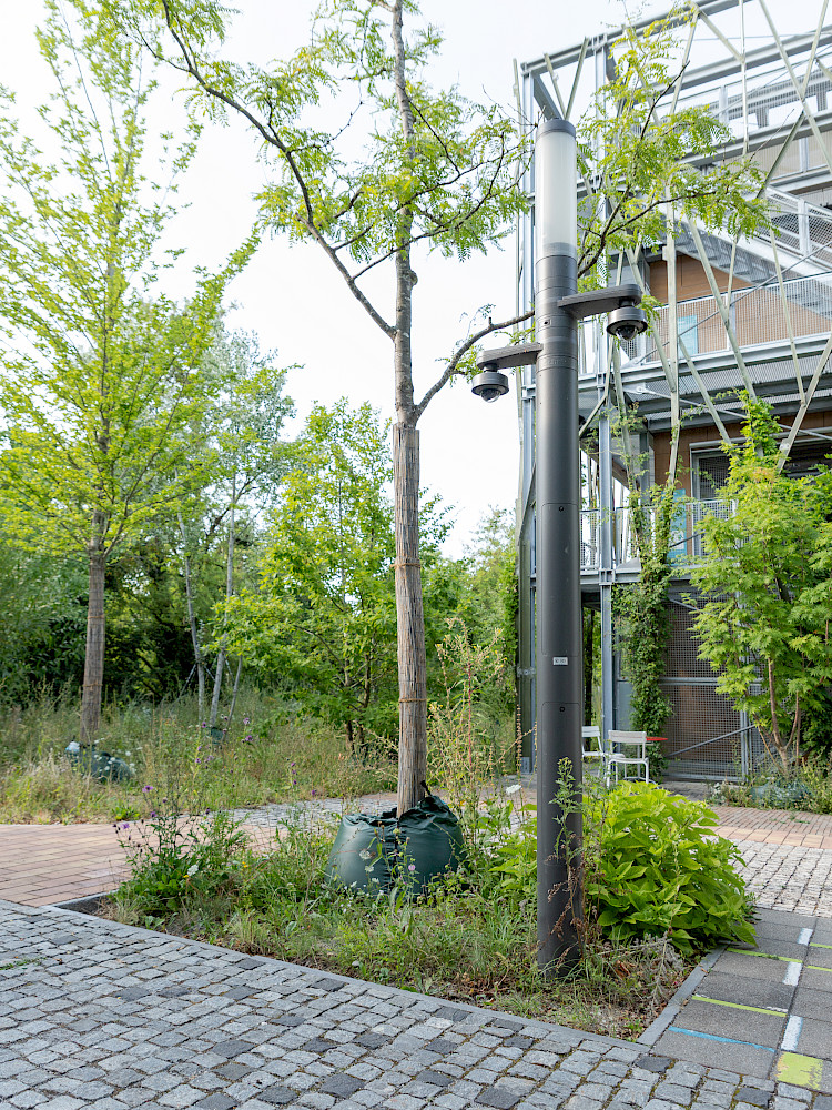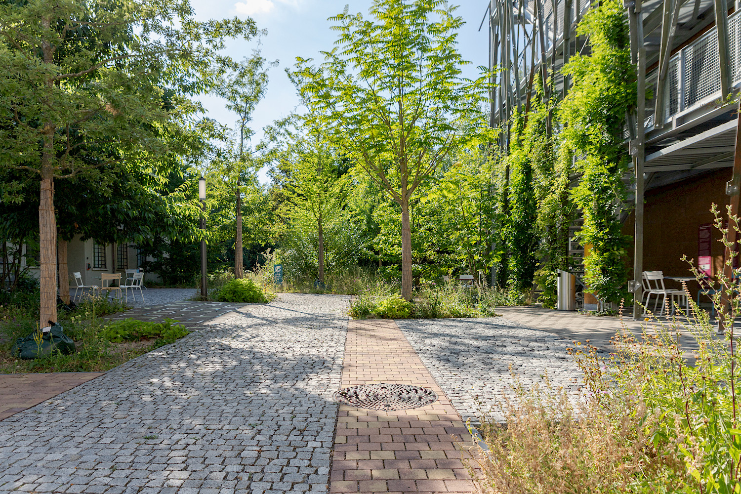 Das neue Besucherangebot «Primeo Energie Kosmos» beschäftigt sich mit den wichtigen Fragestellungen zu Energie und Klima. Als Ort der Wissensvermittlung war im Aussenraum vor allem die Sichtbarmachung einer nachhaltigen Kreislaufwirtschaft von Bedeutung. Aus wiederverwendeten und geretteten Pflastersteinen wurde ein kompletter Platz im Sinne des ReUse-Gedankens geschaffen. Das flexible Konzept der «Streifen» ermöglichte Änderungen im Materialbezug und Bauprozess. Neben seiner Funktion als Empfangs- und Ausstellungsfläche wird der Platz somit selbst zum Ausstellungsobjekt. Die darauf gepflanzten Klimabäume greifen zusätzlich die Thematik des Klimawandels auf. Der Übergang zum angrenzenden Birsraum wird mit ortstypischer Vegetation gestärkt.