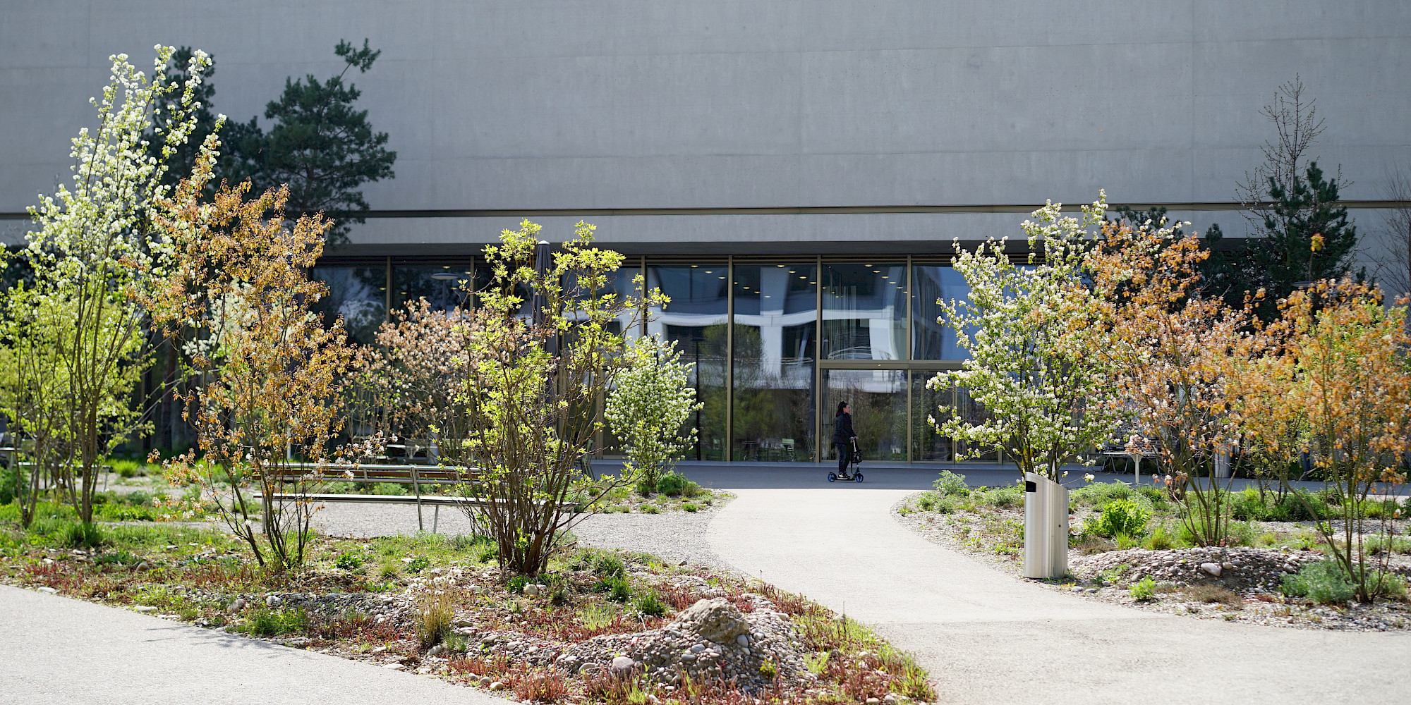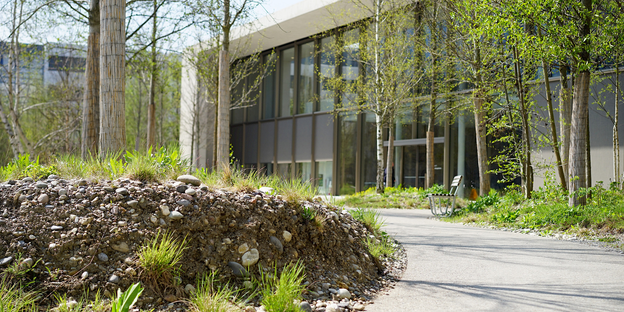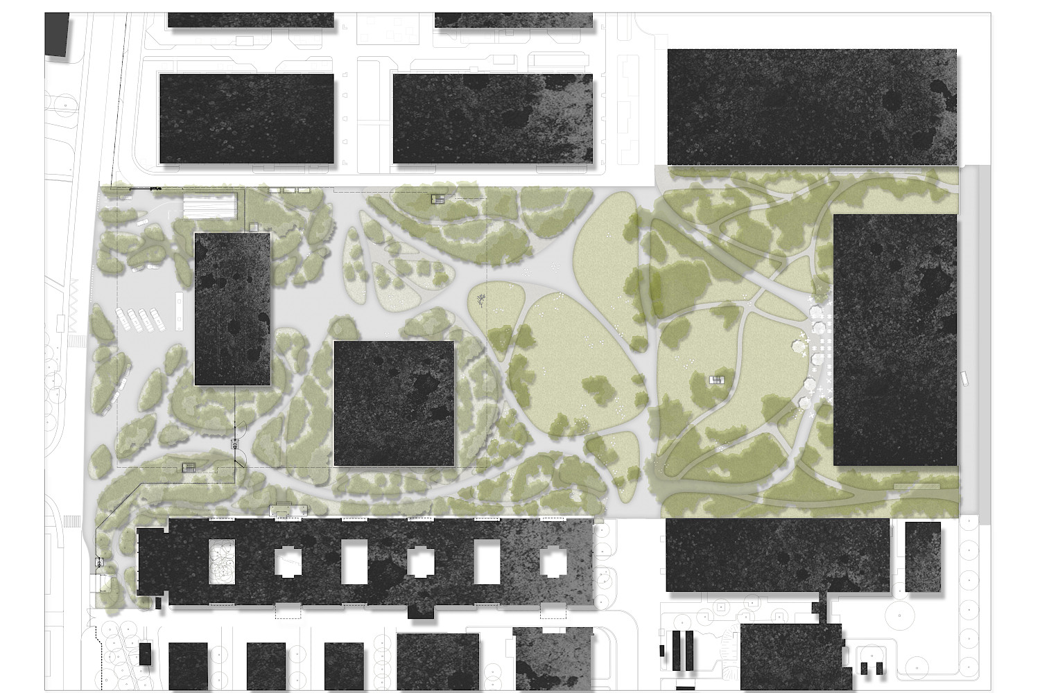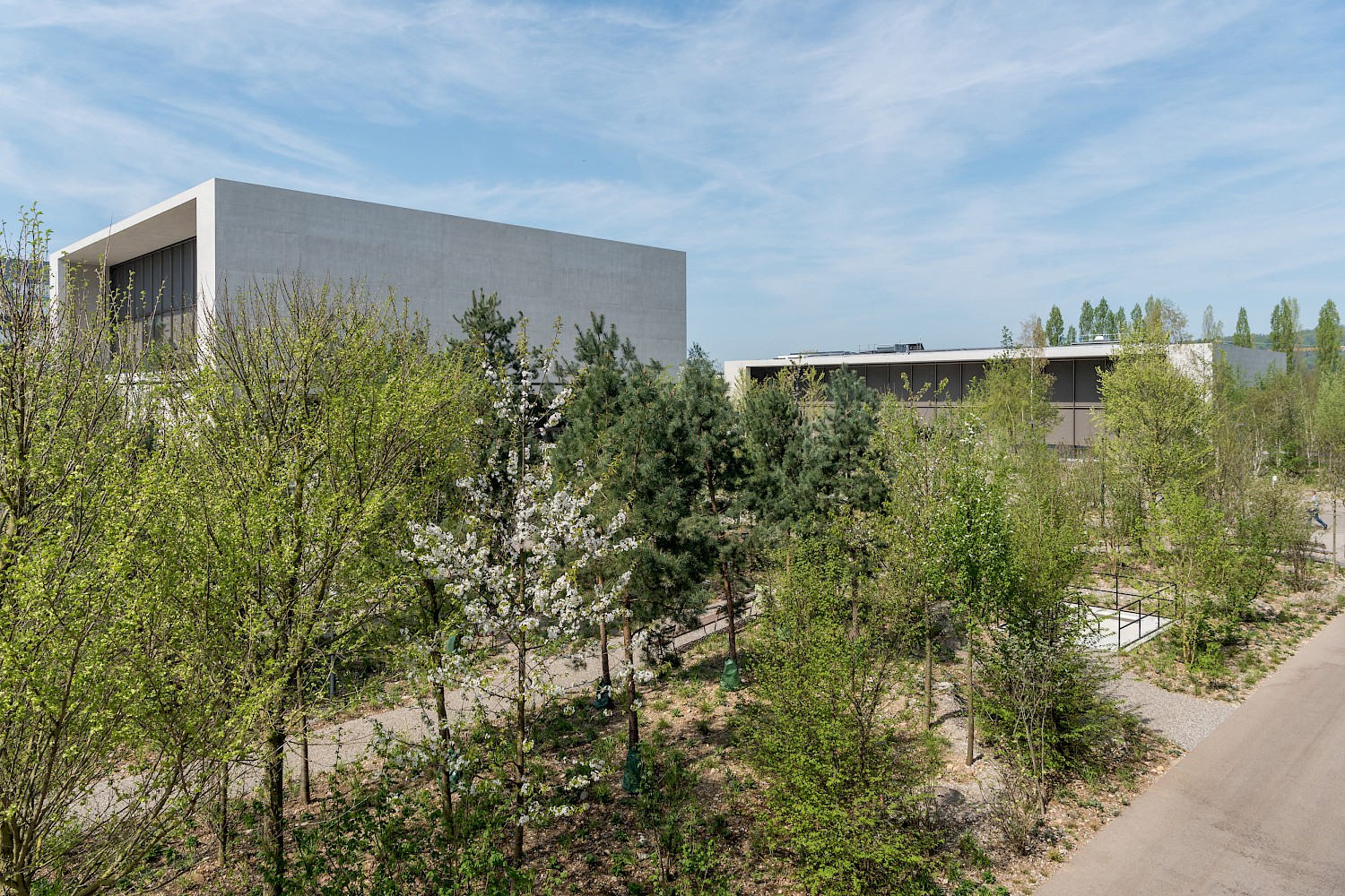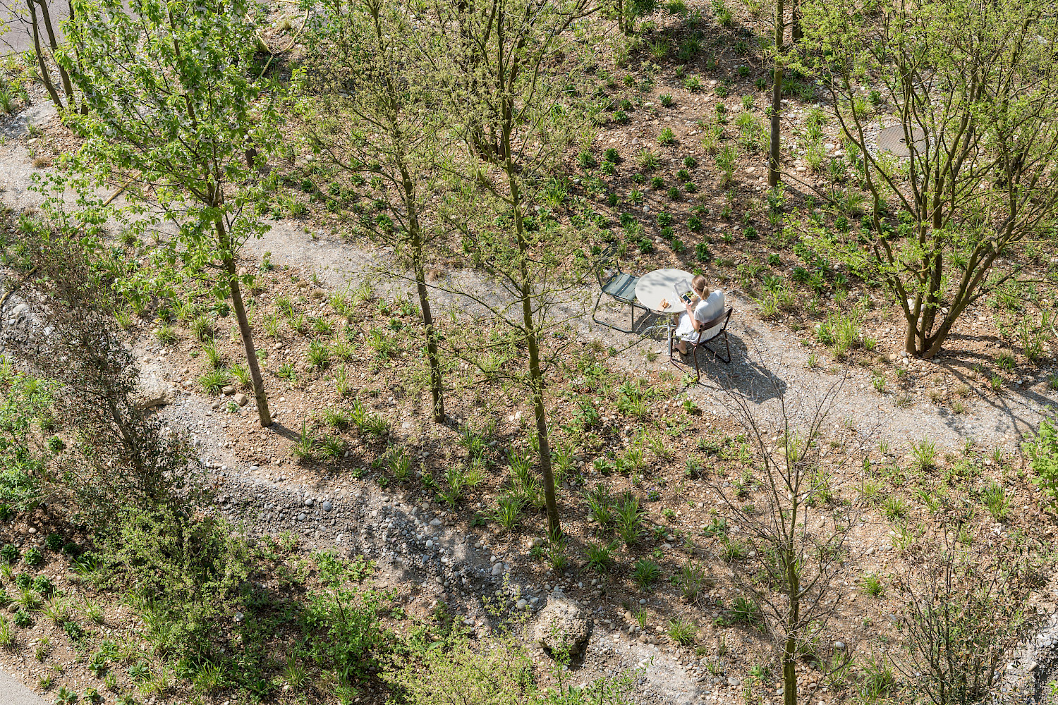 Mit dem zentralen Park bekam das Areal ein neues Herz - eine Auenlandschaft en Minature- als Ort der Ko-Existenz von Mensch und Natur. Es wurde ein Ökosystem über einer Tiefgarage geschaffen, welches einen Verlauf von Landschaftstypen des Rheintals zeichnet. Die Flussaue steht für einen Lebensraum unvorhersehbarer Störungen. Hier wirkt die Störung auf Mensch, Tier und Pflanze in ähnlichem Masse. Das Areal wandelt sich zu einem Standort für zukünftig 8.000 Mitarbeitende. Flora und Fauna siedeln sich an, entwickeln sich, werden verdrängt, erholen sich und bilden ein Miteinander mit den Nutzenden des Parks. Dieser andauernde Prozess produziert Vielfalt anstatt Dominanz. Die Nutzenden sind dabei keine stillen Beobachter, sondern Teil des Ökosystems.