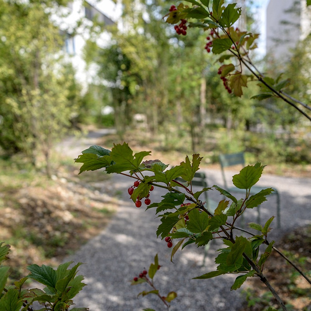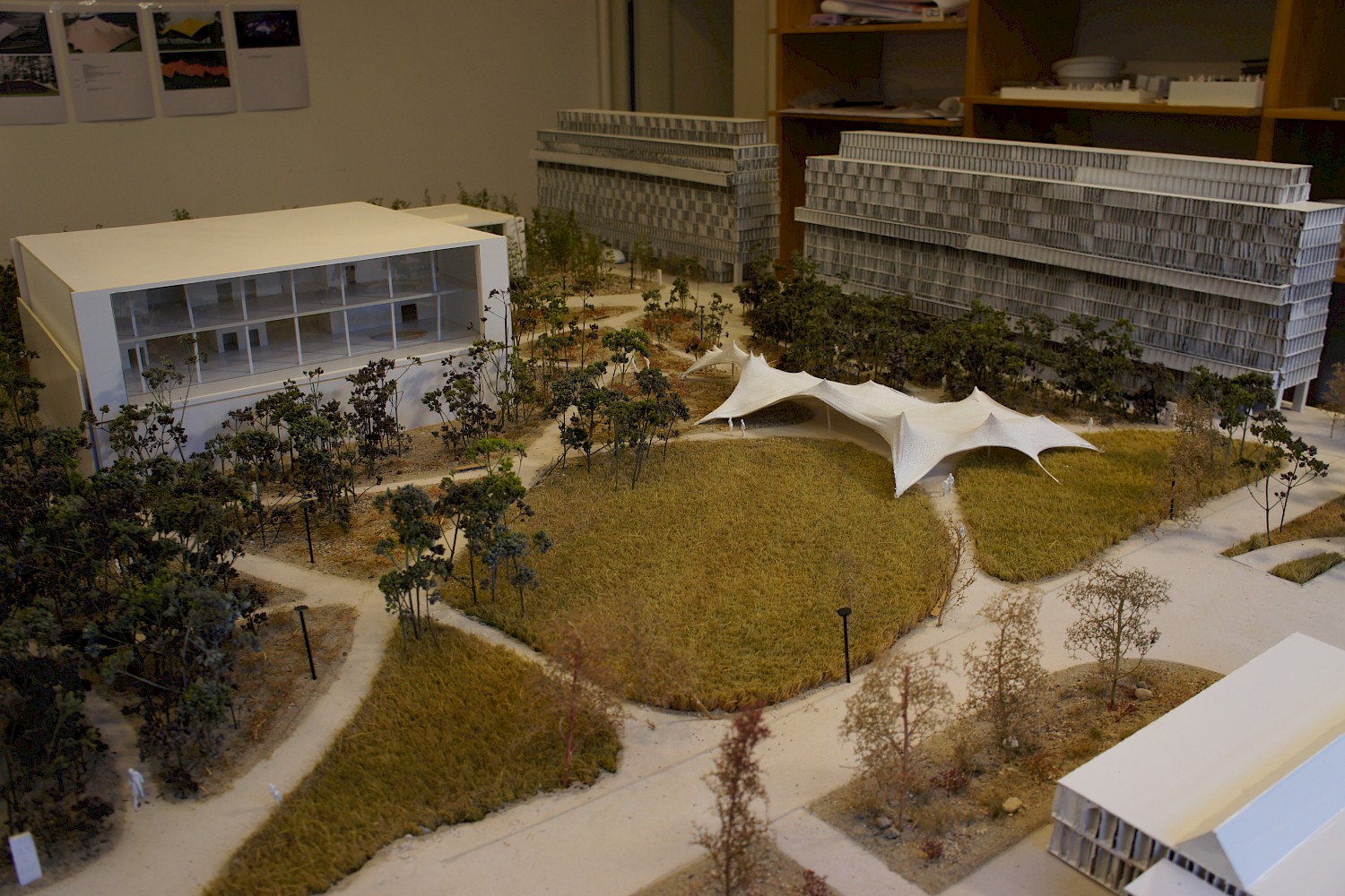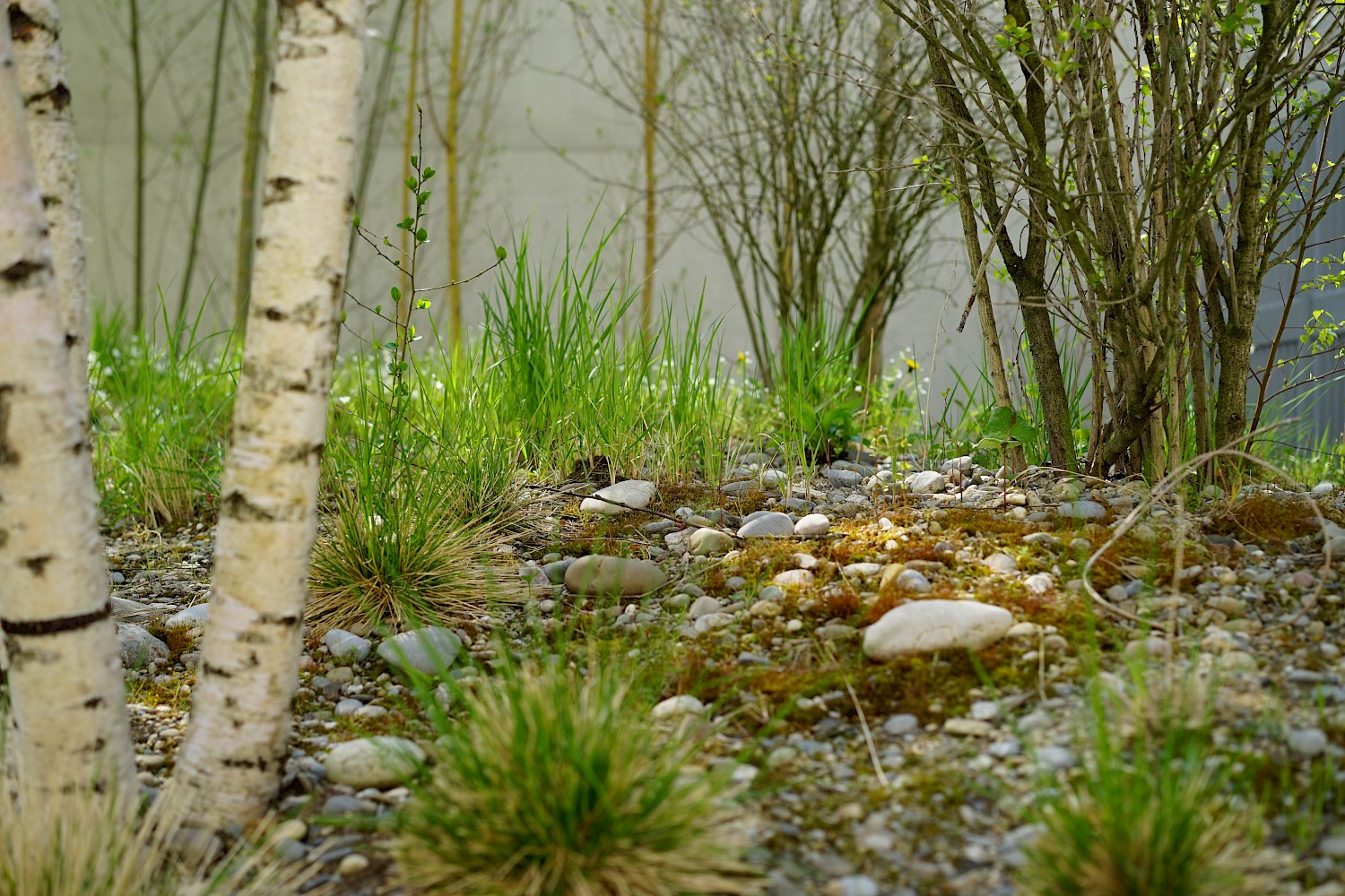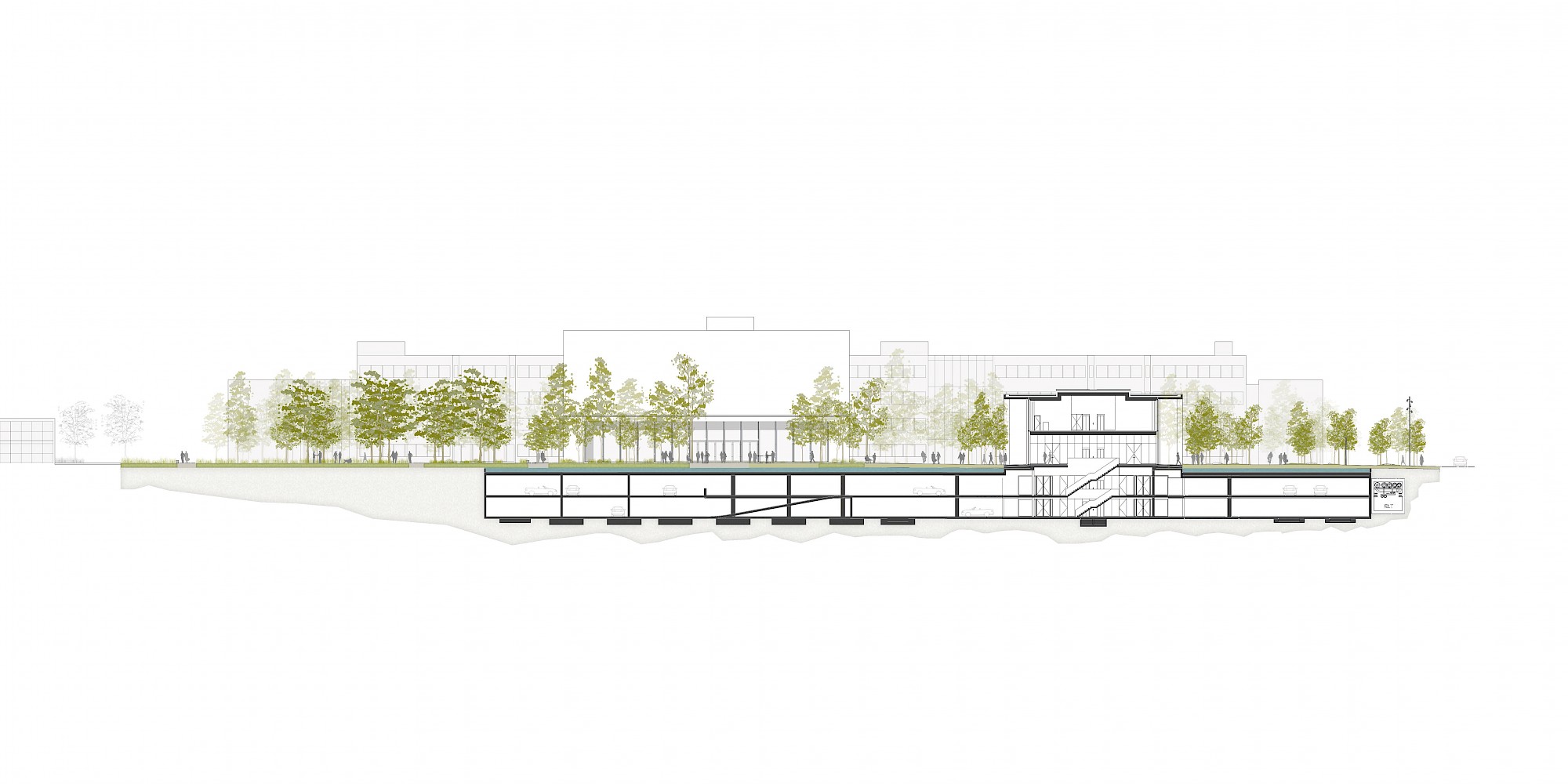 Mit dem zentralen Park bekam das Areal ein neues Herz - eine Auenlandschaft en Minature- als Ort der Ko-Existenz von Mensch und Natur. Es wurde ein Ökosystem über einer Tiefgarage geschaffen, welches einen Verlauf von Landschaftstypen des Rheintals zeichnet. Die Flussaue steht für einen Lebensraum unvorhersehbarer Störungen. Hier wirkt die Störung auf Mensch, Tier und Pflanze in ähnlichem Masse. Das Areal wandelt sich zu einem Standort für zukünftig 8.000 Mitarbeitende. Flora und Fauna siedeln sich an, entwickeln sich, werden verdrängt, erholen sich und bilden ein Miteinander mit den Nutzenden des Parks. Dieser andauernde Prozess produziert Vielfalt anstatt Dominanz. Die Nutzenden sind dabei keine stillen Beobachter, sondern Teil des Ökosystems.