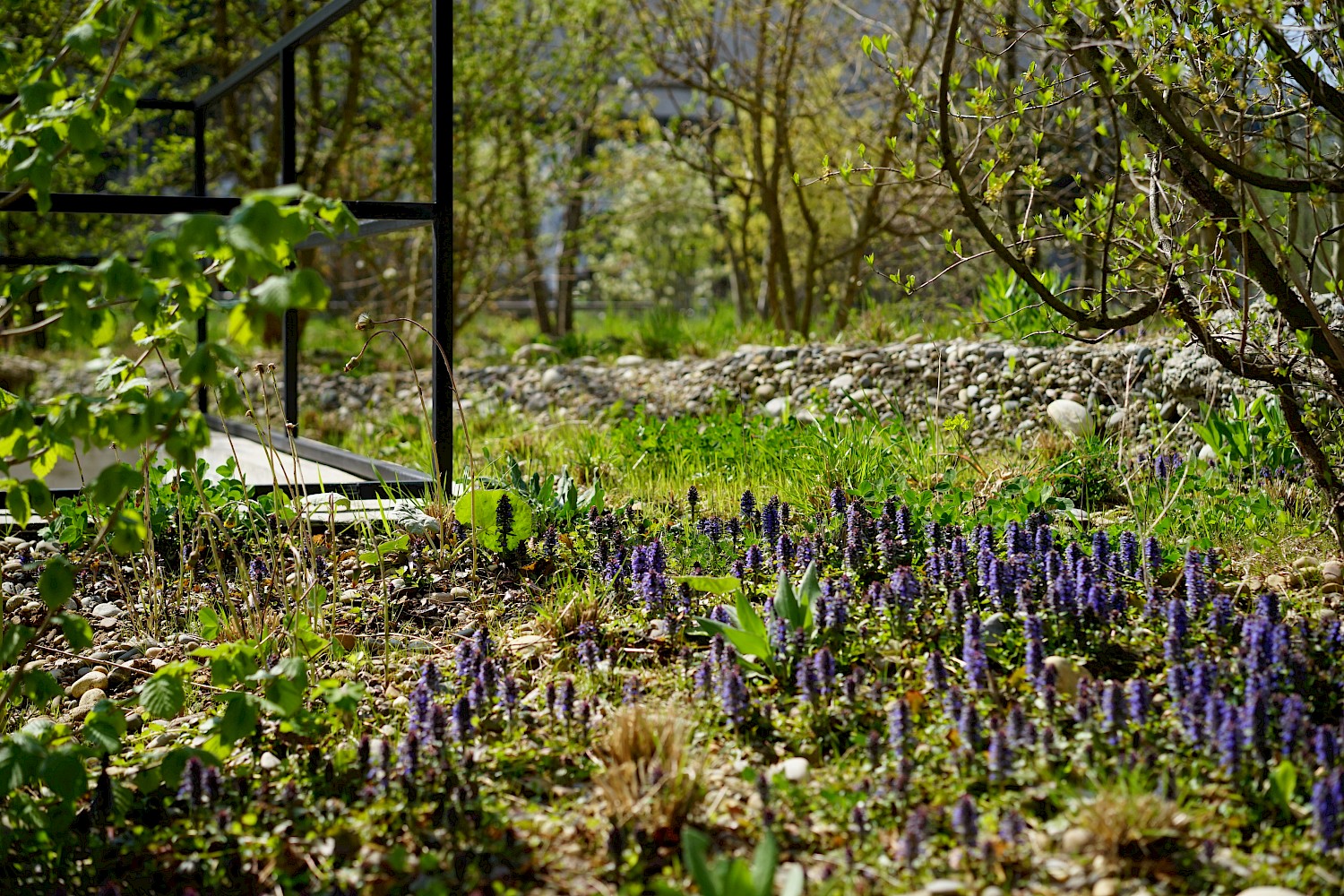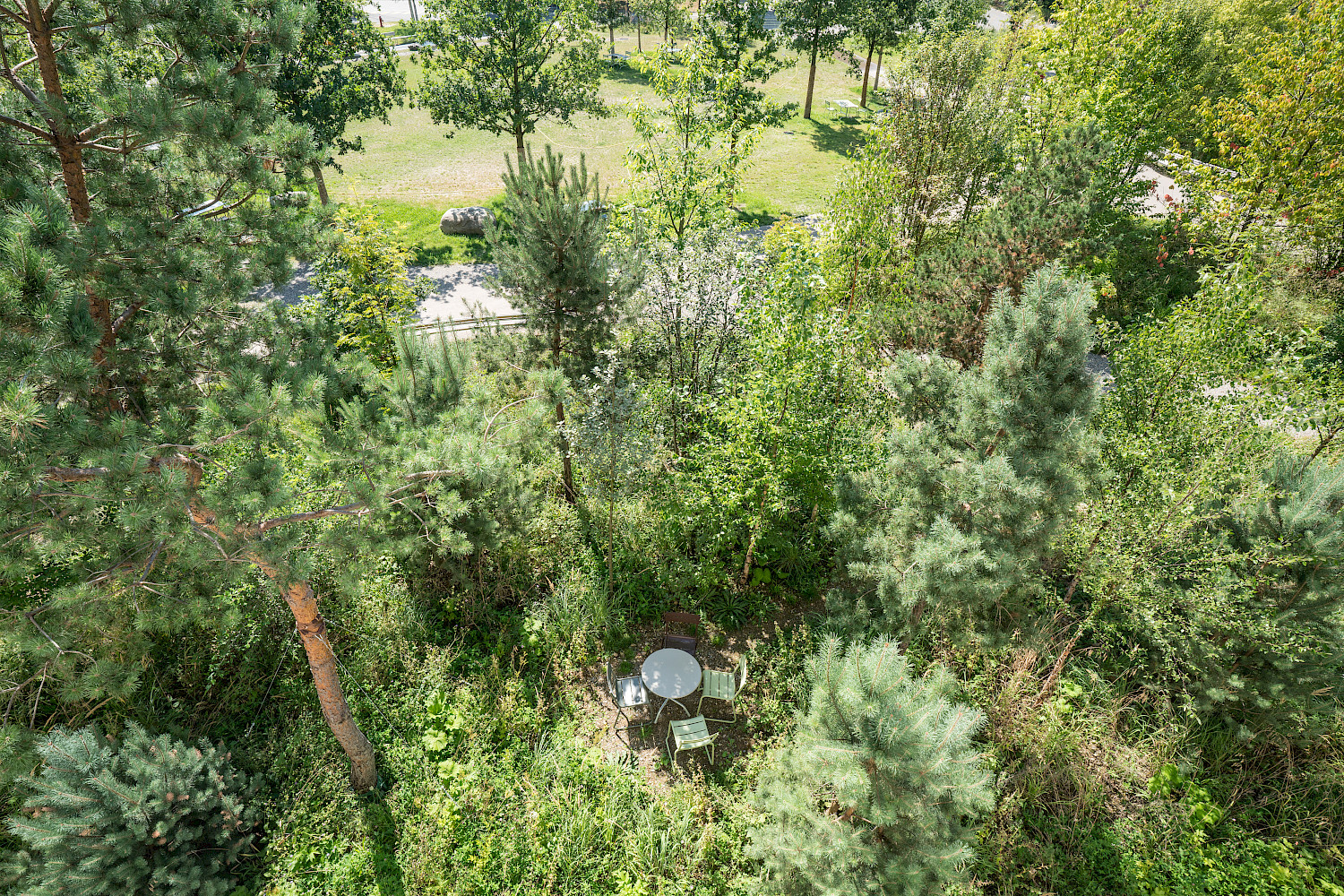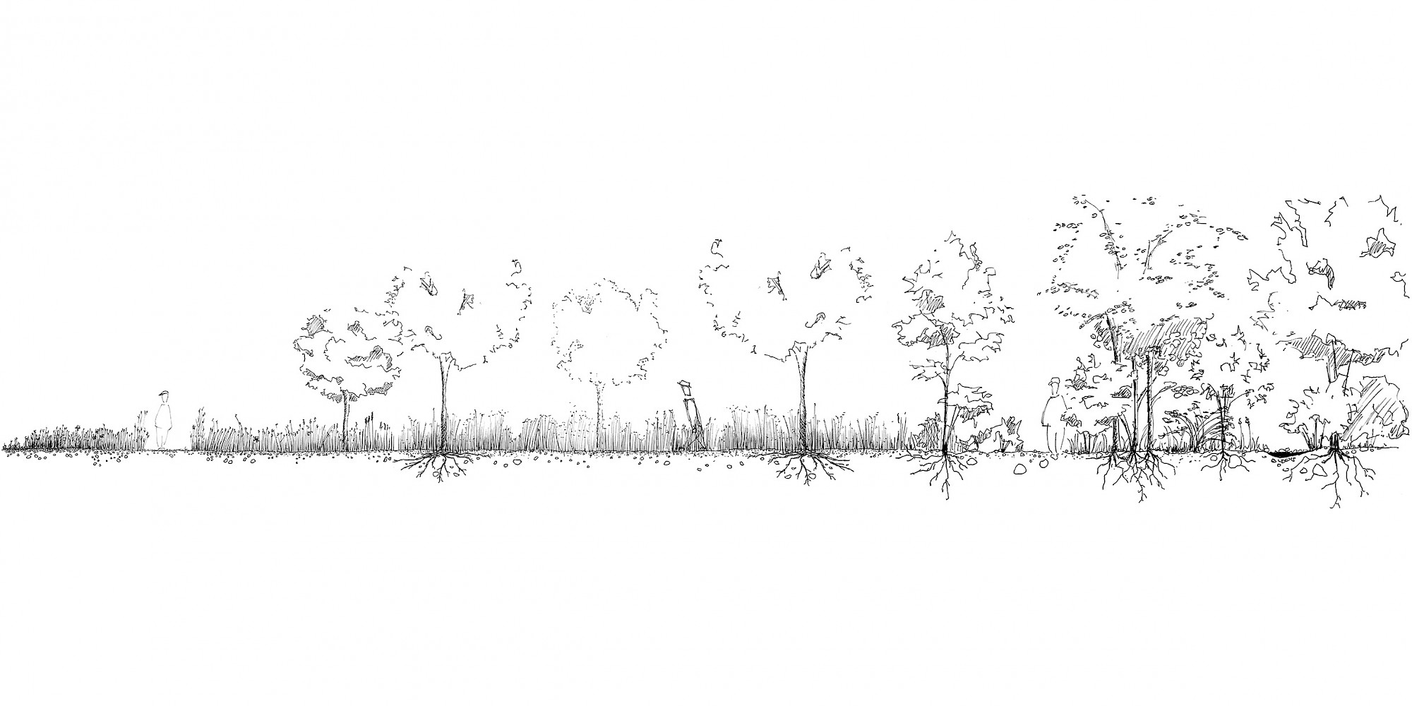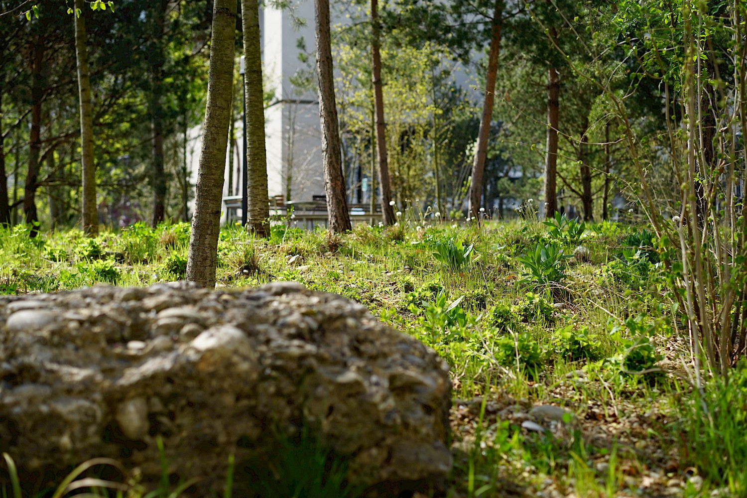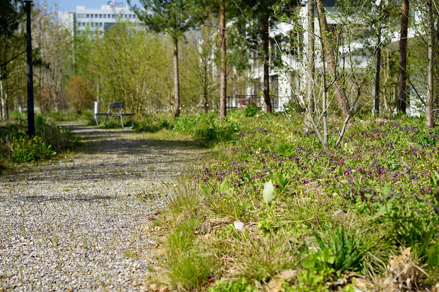 Mit dem zentralen Park bekam das Areal ein neues Herz - eine Auenlandschaft en Minature- als Ort der Ko-Existenz von Mensch und Natur. Es wurde ein Ökosystem über einer Tiefgarage geschaffen, welches einen Verlauf von Landschaftstypen des Rheintals zeichnet. Die Flussaue steht für einen Lebensraum unvorhersehbarer Störungen. Hier wirkt die Störung auf Mensch, Tier und Pflanze in ähnlichem Masse. Das Areal wandelt sich zu einem Standort für zukünftig 8.000 Mitarbeitende. Flora und Fauna siedeln sich an, entwickeln sich, werden verdrängt, erholen sich und bilden ein Miteinander mit den Nutzenden des Parks. Dieser andauernde Prozess produziert Vielfalt anstatt Dominanz. Die Nutzenden sind dabei keine stillen Beobachter, sondern Teil des Ökosystems.