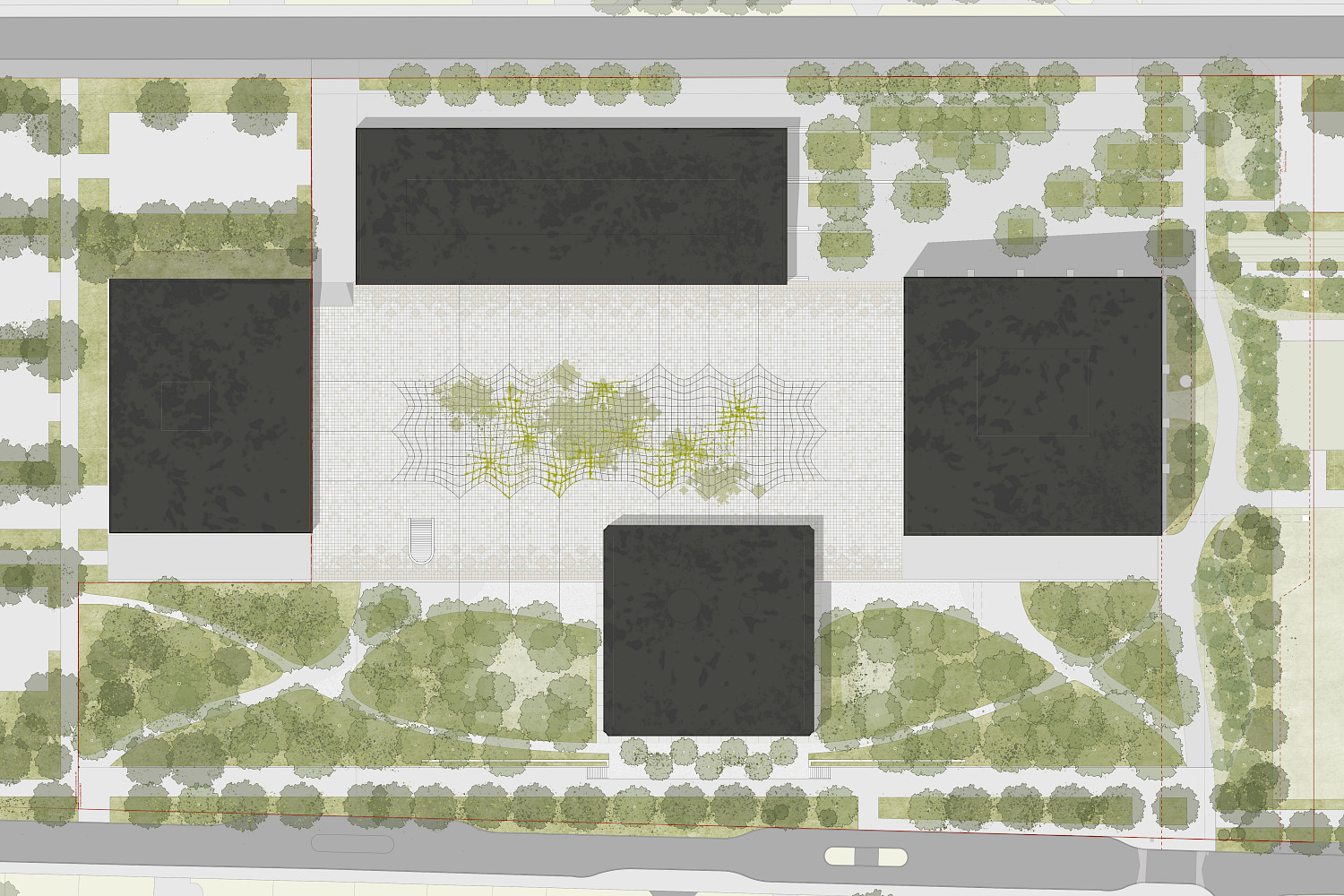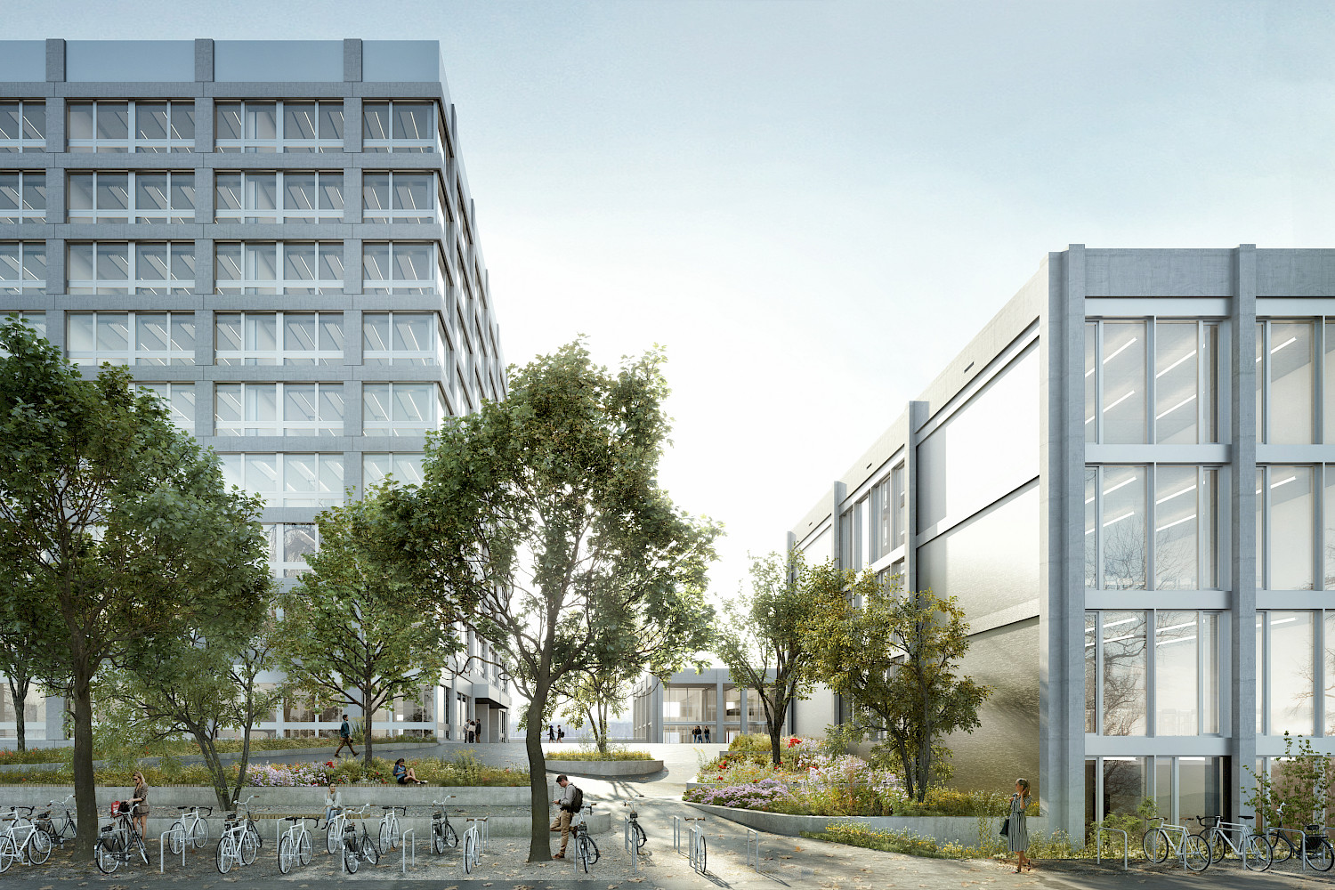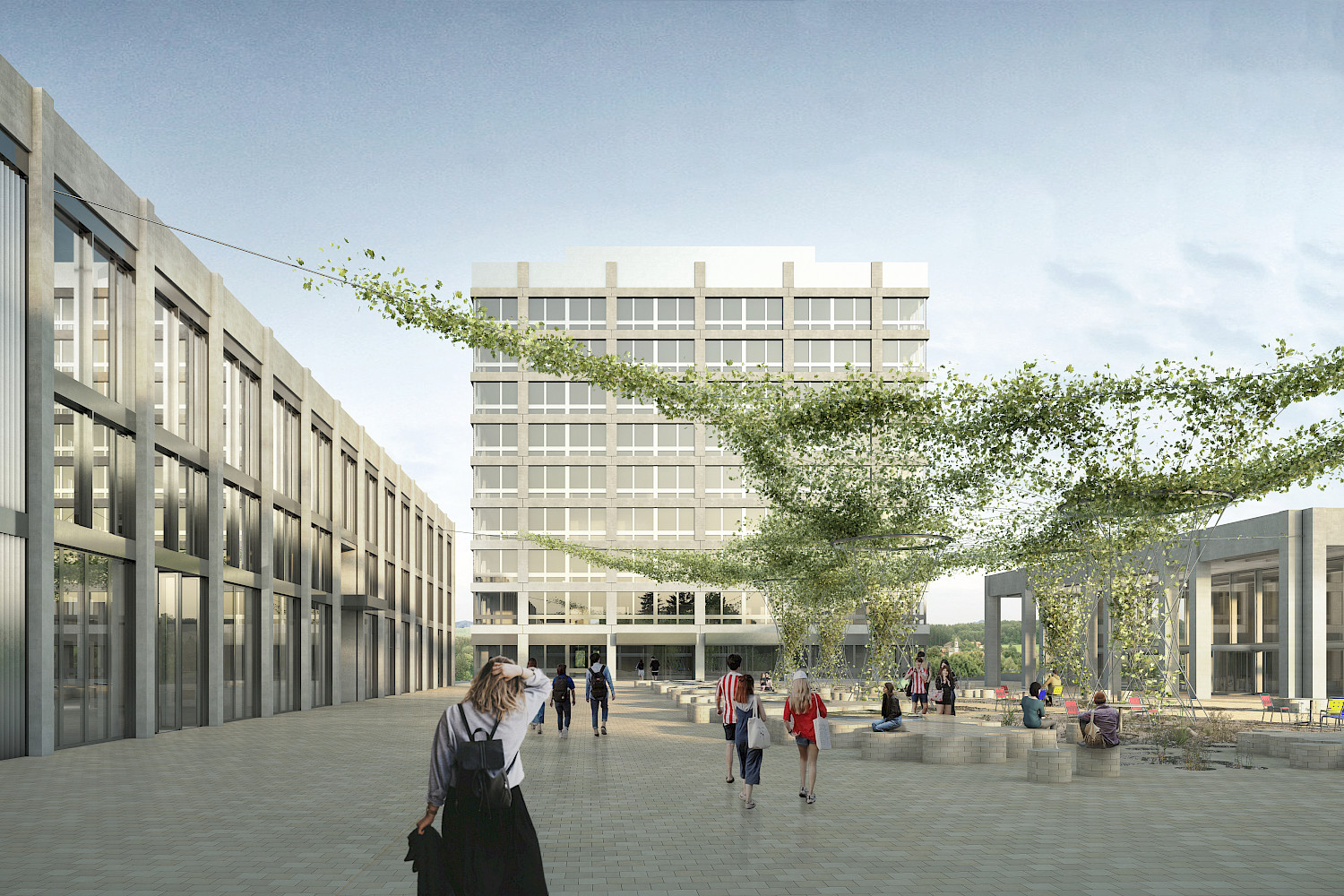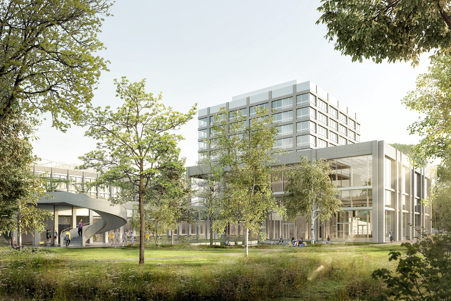 Der Perimeter des Campus liegt am Rande des Polyfeldes an der Schnittstelle zwischen einem durchgrünten, kleinteiligen Einfamilienhausquartier und einem ehemaligen Industrieareal. In diesem massgebenden Kontrast gilt es zu vermitteln. Der SEK II Platz liegt als verbindendes Element im Zentrum des Projekts, er ist gefasst von vier Gebäuden, mit einer Dreifachturnhalle unterbaut und markiert den Hauptzugang für alle Nutzer. Er dient der Orientierung und Verteilung, wie auch der Begegnung und dem Austausch der Nutzer und Nachbarn. Um diesen grossen Platz liegt kontrastierend ein semipermeabler grüner Filter. Im südlichen Arboretum verdichtet sich dieser und bildet eine Schnittstelle mit Aufenthaltsqualität zu den Gärten der Wohnhäuser.