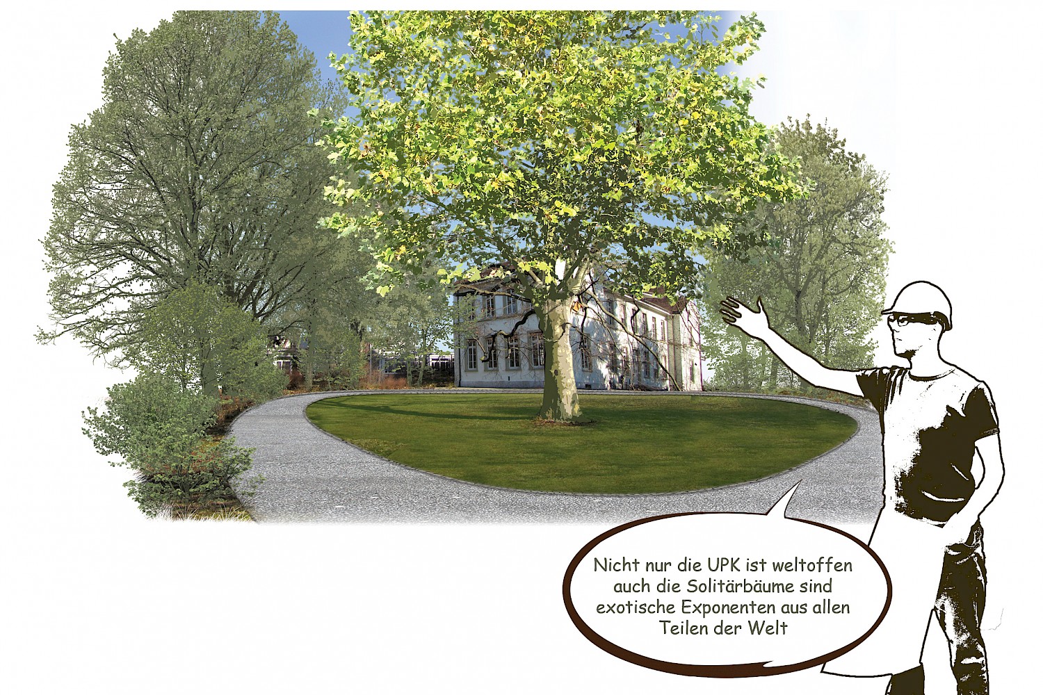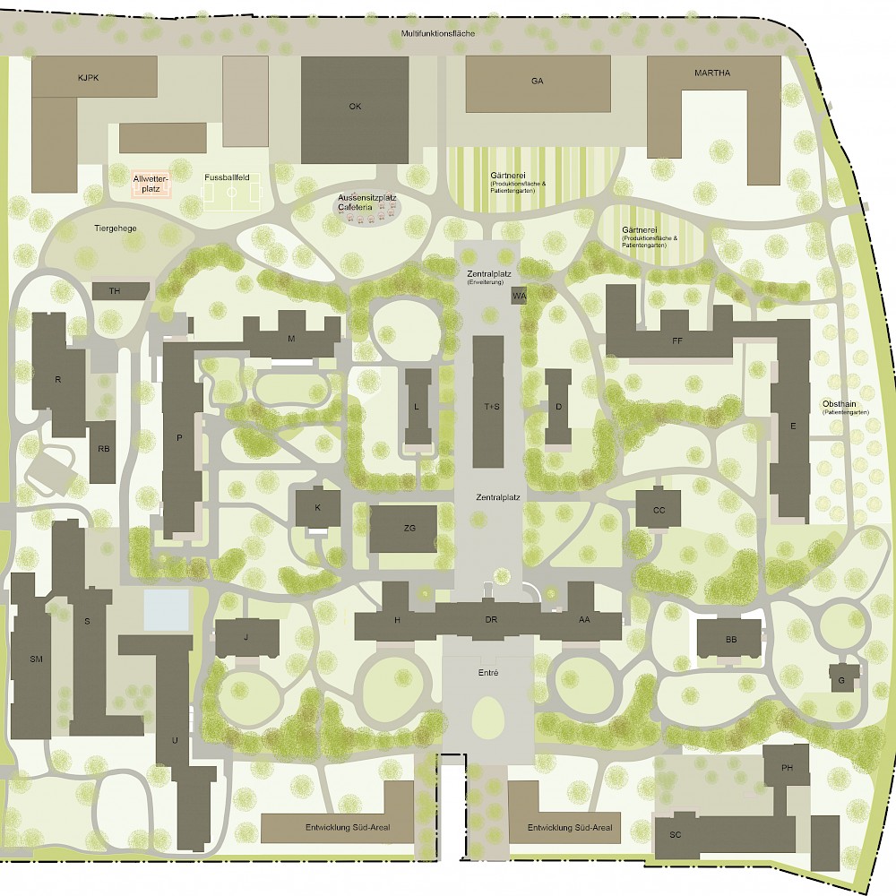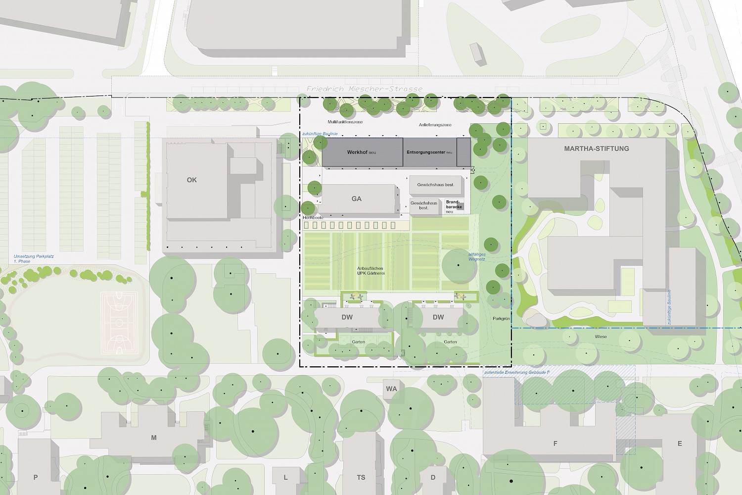 Der historische und zentralsymmetrisch aufgebaute Aussenraum der UPK erfährt aufgrund sich verändernder Nutzungsansprüche am Klinikbetrieb immer wieder Eingriffe in seiner Ursprungssubstanz. Das Gesamtfreiraumkonzept arbeitet mit Gestaltungs- und Pflegeprinzipien, die den Charakter der Anlage in ihrem Kern stärken. Durch die Anwendung dieser Prinzipien wird die Atmosphäre der Anlage erhalten, wodurch Neu und Alt zusammenwachsen. Projektparameter von entstehenden Neubauten werden dabei über die Prinzipien des Freiraums definiert. Die langjährige Zusammenarbeit mit der UPK festigt sich allmählich in der Anlage zu einem stimmigen Gesamtbild.